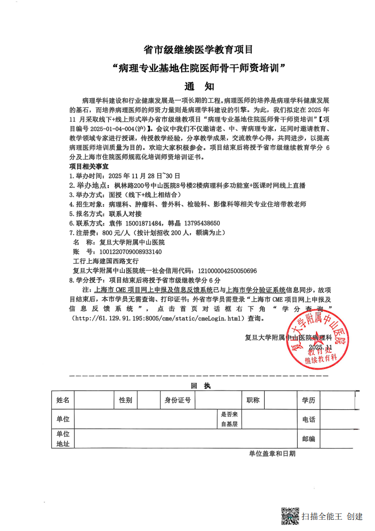 病理学科建设和行业健康发展是一项长期的工程。病理医师的培养是病理学科健康发展的基石,而培养病理医师的师资力量则是病理学科建设的引擎。为此,我们拟定在2025年11月采取线下+线上形式举办病理专业基地住院医师骨干师资培训继续教育学习班【项目编号2025-01-04-004(沪)】。会议中我们不仅邀请老、中、青病理专家,还同时邀请教育、教学领域专家进行授课,传授教学经验,分享教学成果,交流教学心得,共同进步,以提高病理医师培训质量为目的。欢迎大家积极参会。项目结束后将授予省市级继续教育Ⅰ类学分6分及上海市住院医师规范化培训师资培训证书。