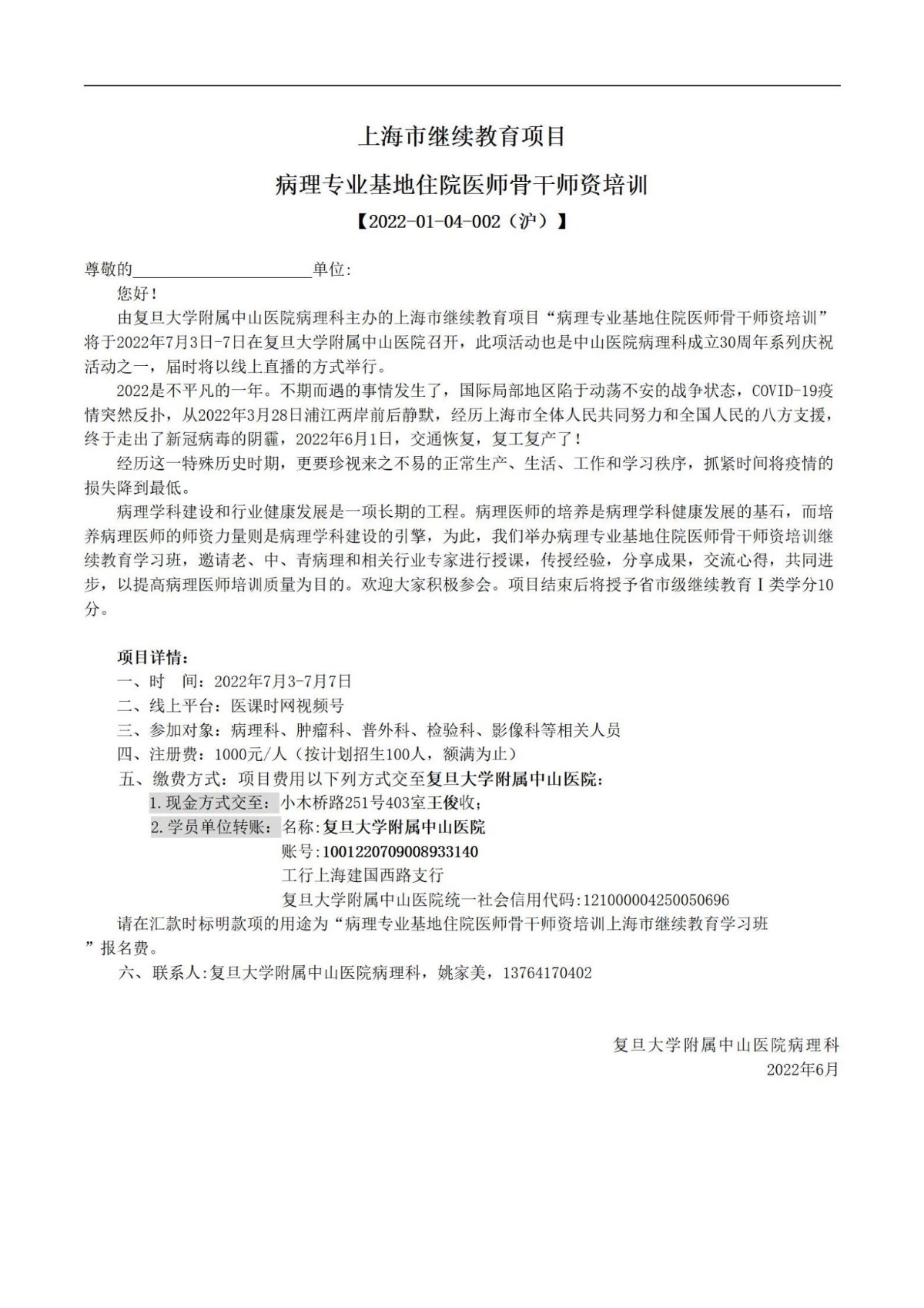 请在汇款时标明款项的用途为“病理专业基地住院医师骨干师资培训上海市继续教育学习班”报名费。