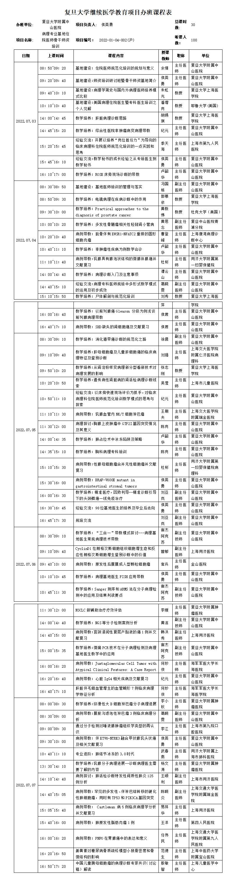 由复旦大学附属中山医院病理科主办的上海市继续教育项目“病理专业基地住院医师骨干师资培训”将于2022年7月3日-7日在复旦大学附属中山医院召开,此项活动也是中山医院病理科成立30周年系列庆祝活动之一,届时将以线上直播的方式举行。