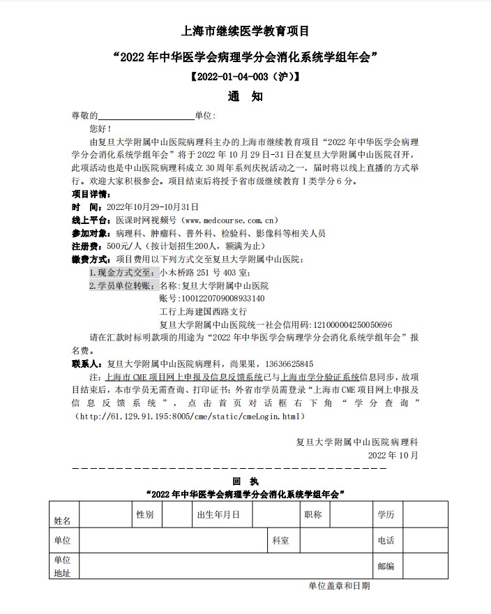由复旦大学附属中山医院病理科主办的上海市继续教育项目“2022年中华医学会病理学分会消化系统学组年会”将于2022年10月29日-31日在复旦大学附属中山医院召开,此项活动也是中山医院病理科成立30周年系列庆祝活动之一,届时将以线上直播的方式举行。欢迎大家积极参会。项目结束后将授予省市级继续教育Ⅰ类学分6分。
